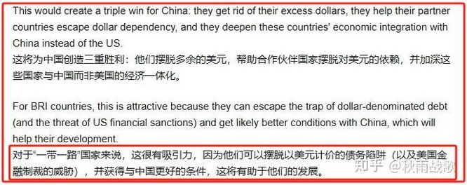 中国呢,既消化了美元库存,化解了各国的债务危机,扩大了人民币国际化,又获得了资源,牢固了一带一路国家的双边关系,哪个国家还会喝着西北风,跟美国高喊自由民主?