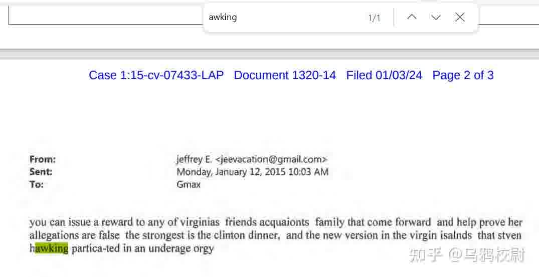 乌鸦翻了法院公布的那份文件,一共900多页还是纯英文,确实没有时间逐字逐句地读完,但简便一点,通过检索关键词“Hawking”,不难发现霍金只在文中出现过两次。