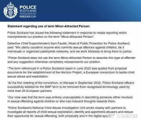 然而就在去年,一则苏格兰警方的通告正式用“Minor-attracted people”(直译为被小孩吸引的人)替代了用于指代恋童癖的Pedophiles,眼看着就奔将其去病理化的、加入性别全家桶的道路就去了。虽然最后警方为此专门发文澄清,但结合最近曝光的萝莉岛内部,人们甚至有理由怀疑那就是一次舆论试水,实在是让人惊呼你们欧美变态真会玩。