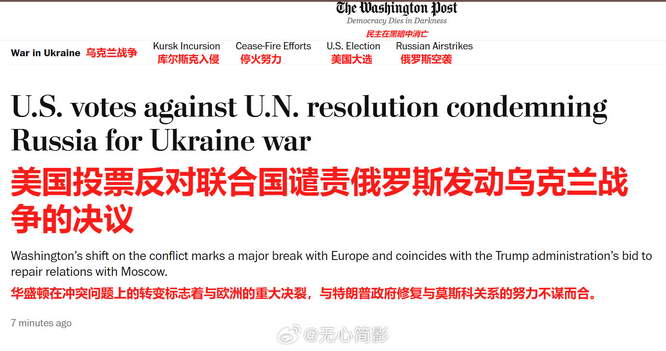 @无心简影:最新消息:联合国通过乌克兰谴责俄罗斯的决议,要求俄罗斯撤出乌克兰。