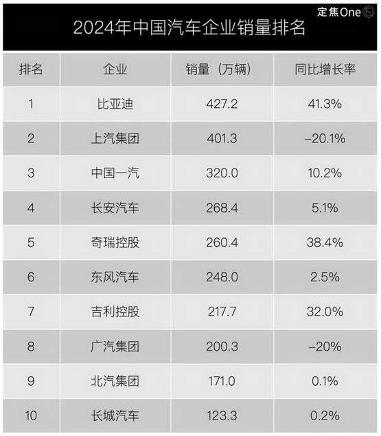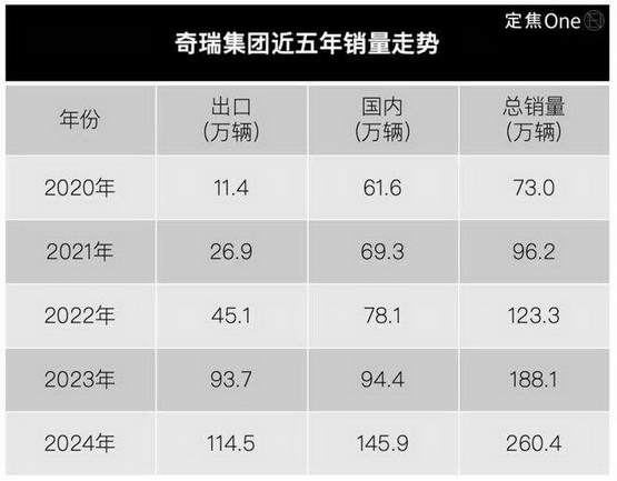 但 2015 年以后,随着 SUV 热潮兴起、新能源转型加速,守着燃油车基本盘的奇瑞排名出现下滑。经过一系列调整,奇瑞近年在国内销量排在 5-8 名之间,但凭借出口优势,总销量杀进前五。2024 年,奇瑞一共卖出 260 万辆车,仅落后于比亚迪、上汽、一汽和长安。
