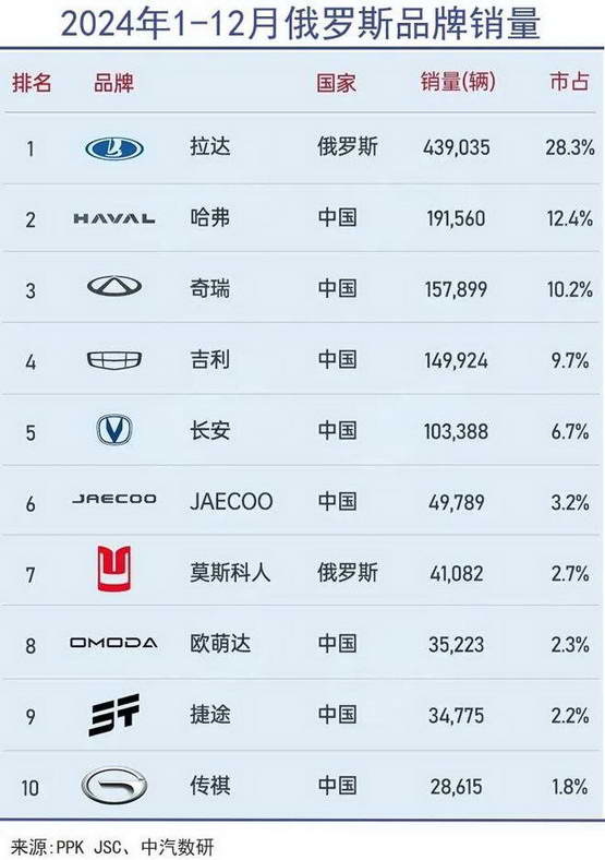 奇瑞早在 2005 年就进入了俄罗斯市场,不过,真正让奇瑞起飞的还是 2022 年之后,西方汽车品牌集体撤出俄罗斯,奇瑞趁机补位 ——2024 年,三个品牌(奇瑞、欧萌达、捷途)都冲到销量榜前十。