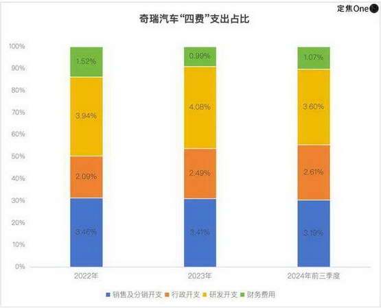 奇瑞要想加快新能源转型,需要加大研发投入。从 2022 年到 2024 年 1-9 月近三年,奇瑞在技术研发上累计砸了近 170 亿元(分别是 36.5 亿元、66.6 亿元、65.5 亿元),不过,研发费用占收入的比例一直在 3.5%-4.1% 区间。