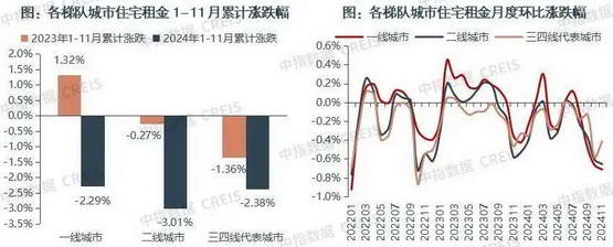 按照中指研究院 50 城住宅租赁价格指数,2024 年,全国重点 50 城住宅平均租金累计下跌 3.25%,跌幅比 2023 年扩大了 2.95 个百分点。