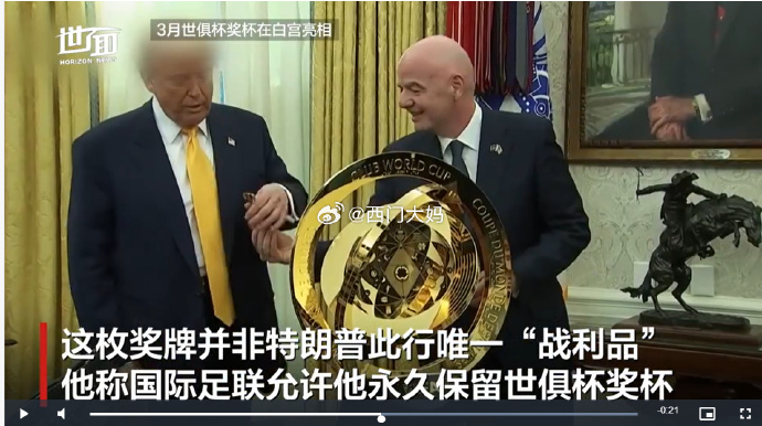 更让人绷不住的是,奖杯也被他带走了!就放在白宫!懂王说,这是国际足联让他 “暂时保管” 的!后来他们就不要了,送他了!这个奖杯现在叫 “特朗普金杯”….