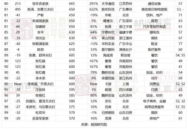 此外,“奶茶” 界知名品牌古茗、霸王茶姬和沪上阿姨成功上市,39 岁的王云安、30 岁的张俊杰和 47 岁的单卫钧与其妻子周蓉蓉分别以 185 亿元、135 亿元和 95 亿元财富首次上榜。