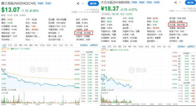 一个是在美股的市值 24 亿美元(约 170 亿人民币)霸王茶姬,一个是 A 股市值 431 亿的天合光能。