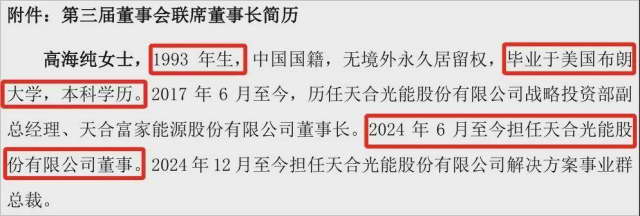高海纯有着最美 “光二代” 的称号,今年年初 高海纯担任 天合光能联席董事长。