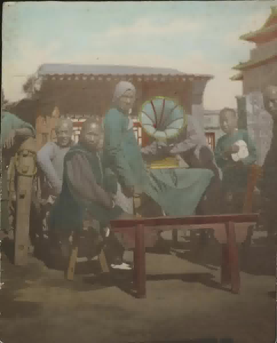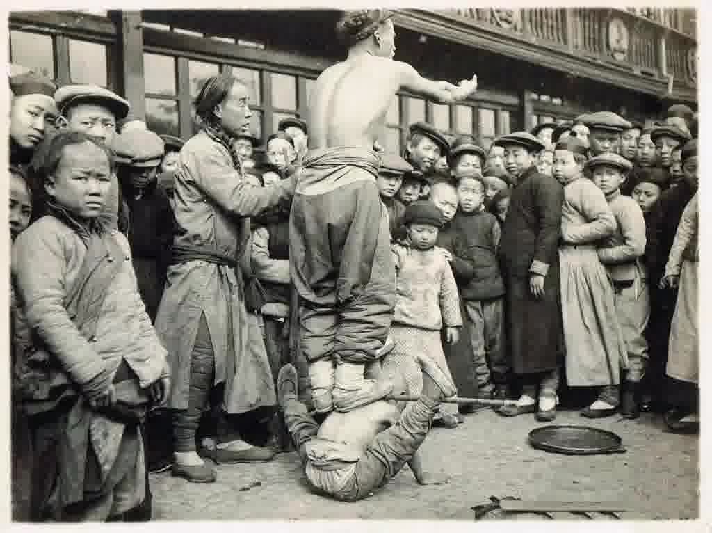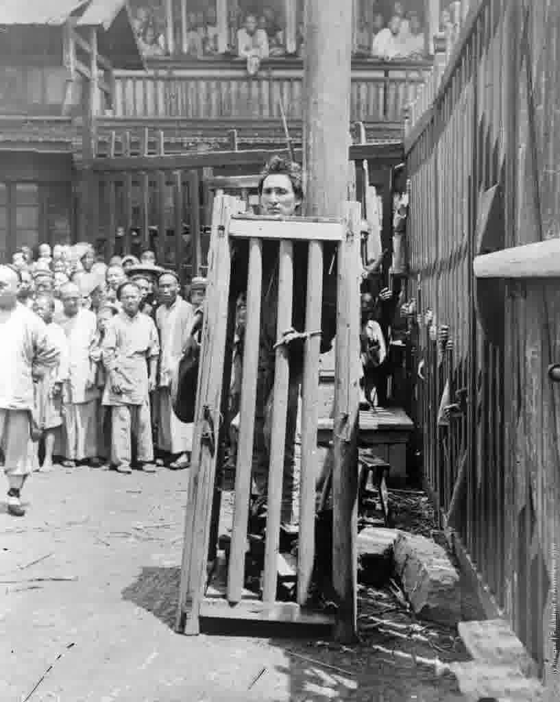 15.1906年一个正在遭受“站笼刑”的犯人,站笼上端是个卡住犯人脖子的枷,脚下垫着砖头和石块,衙役每天都会从犯人脚下抽走一块砖石,直到犯人因双脚悬空而被吊死…这种刑罚除了示众羞辱以外,还对人体进行了最大限度的折磨…