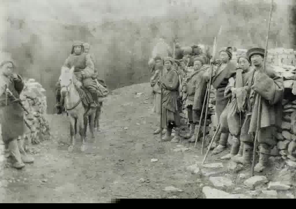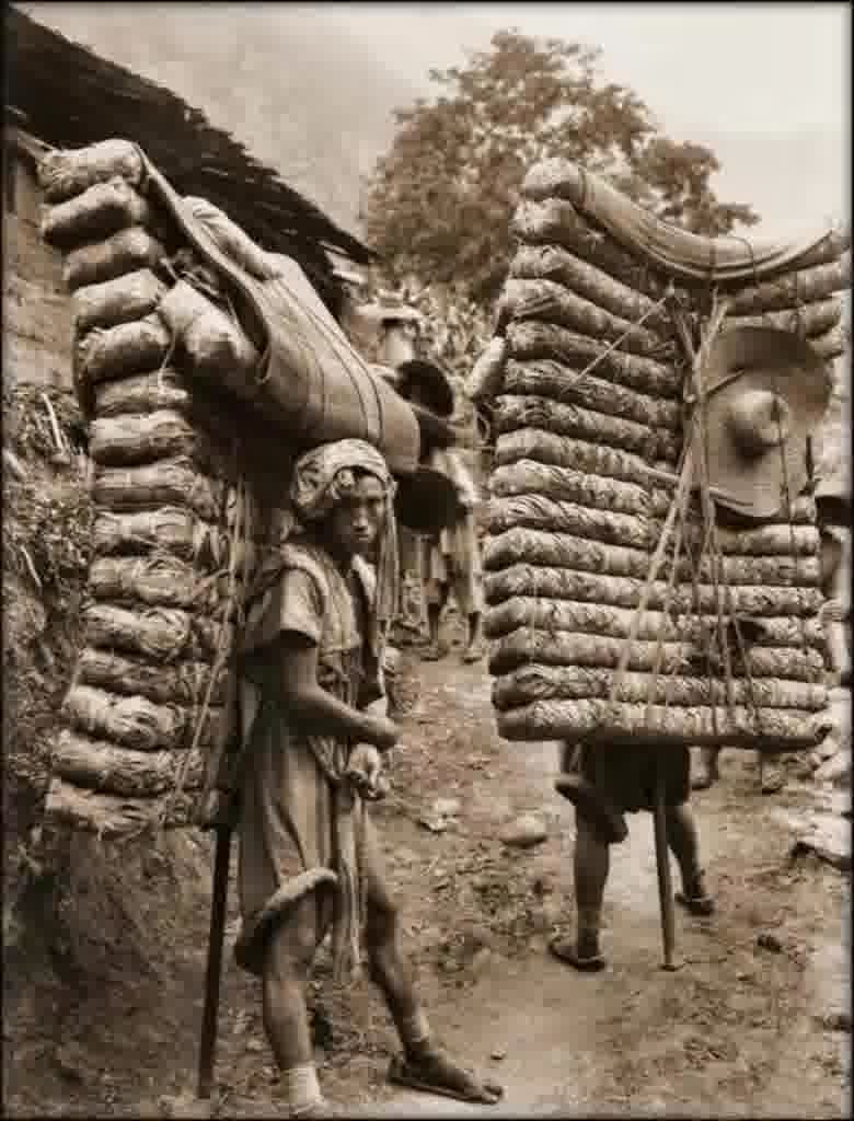 4.1908年四川几名背着茶砖去卖的农民,他们往往需要背着这些沉重的茶砖走上百里路才能抵达集市。
