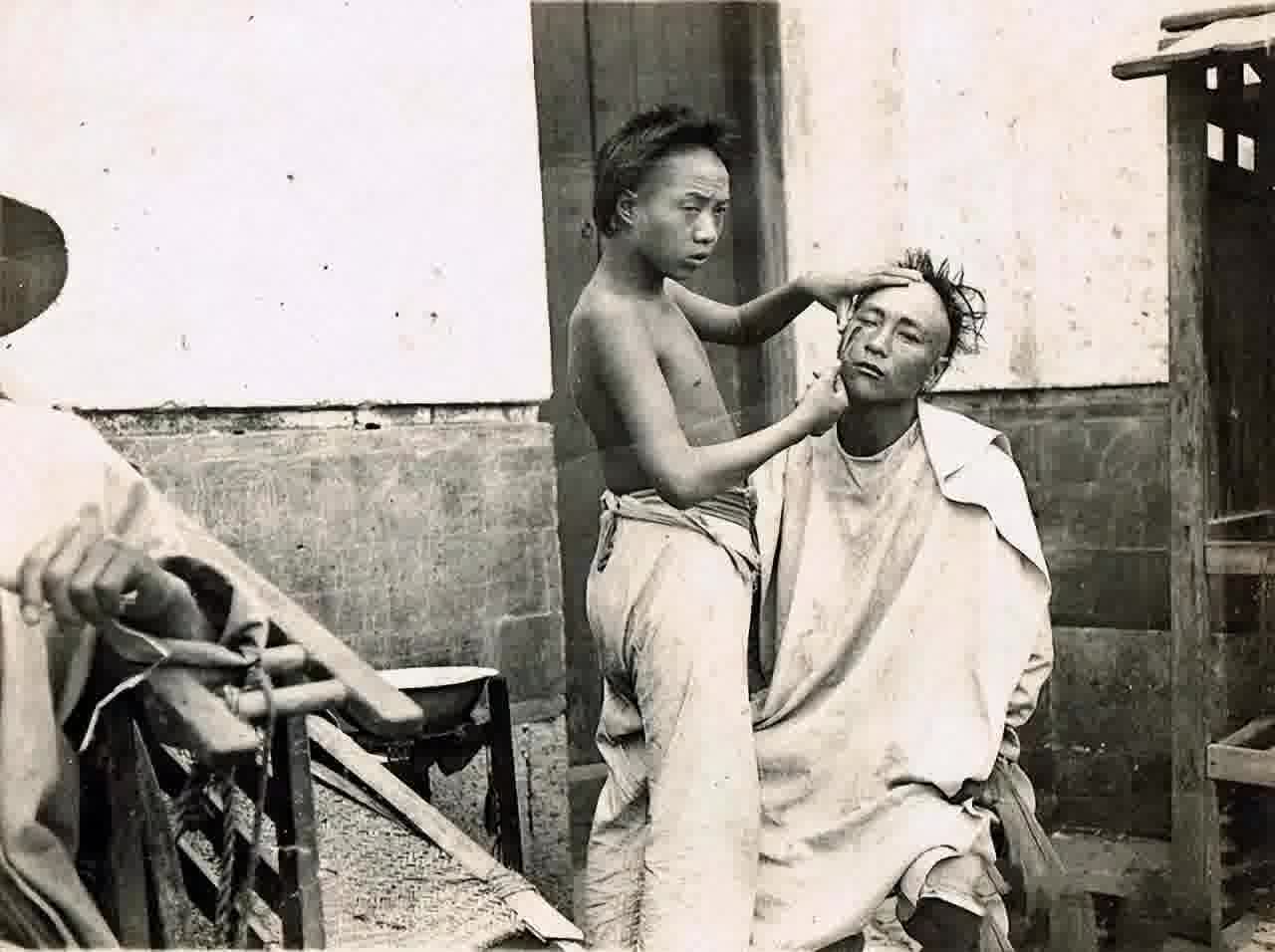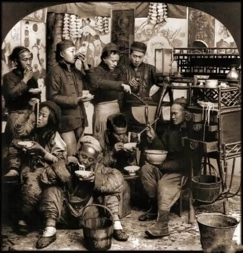 7.清朝末期的广州街头,几名食客正聚集在卖面条的街头小贩旁边吃面。