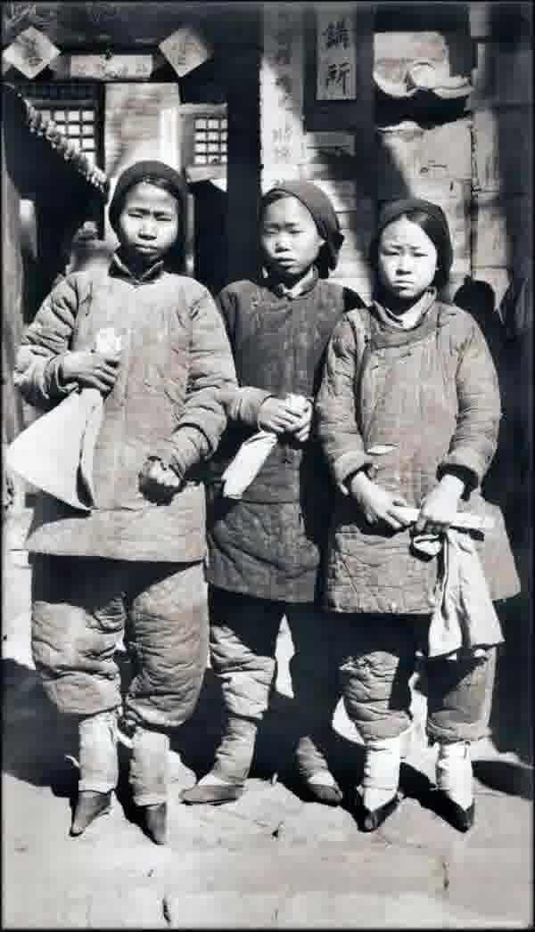 10.三个正在接受缠足的女孩,为了获得所谓的“三寸金莲”,那时候的女孩从四五岁起便开始缠足,使得脚部畸形变小,直到成年骨骼定型后才解开…