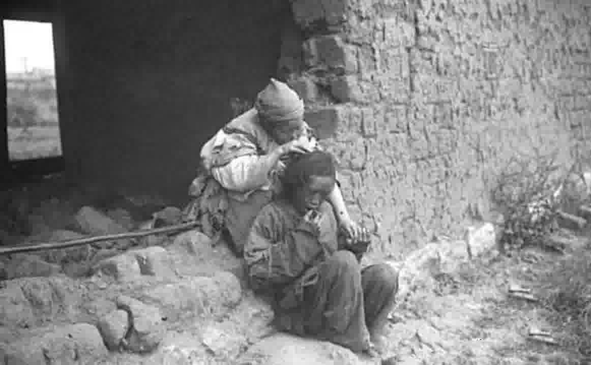 19.在一间没有门的破旧房子旁边,两个乞丐正在抓头上的虱子。有句老话叫“穷长虱子富长疮”,当时卫生条件差,穷人没法天天洗澡换衣服,身上长虱子是常有的事…