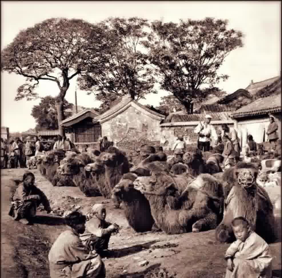 24.1901年北京街头一支正在休息的骆驼队,在现代交通工具出现之前,长途运输货物通常都是依靠驼队进行的。
