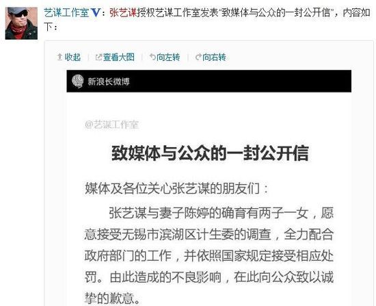 昨晚,张艺谋通过官方微博承认育有两子一女。据悉,张艺谋及妻子陈婷近日已委托其代理人到无锡市滨湖区计生局接受调查。