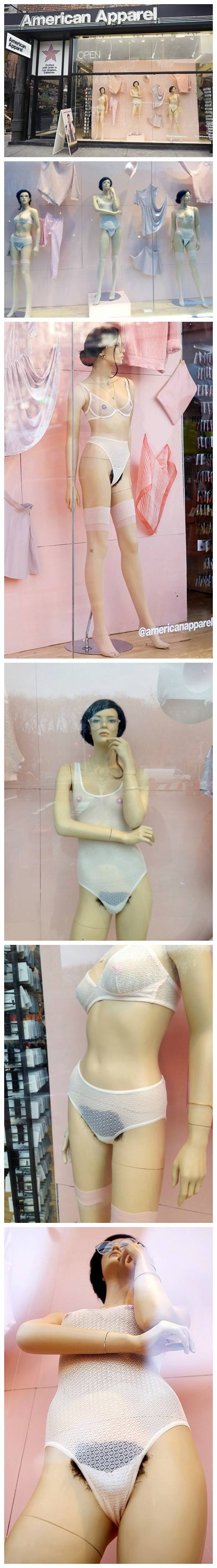 American Apparel前阵子才出了令人发指的姨妈Tee,他们又马不停蹄地把丧心病狂推向了新高度——【给假人模特装阴毛】在AA一家纽约门店的橱窗里,最近出现了3位内衣假人模特,它们【上有点下有毛】,彪悍的阴毛甚至茂盛出了内裤的势力范围。AA公司说,这是在发扬自然美。确实,最自然的东西有时是最雷人的!