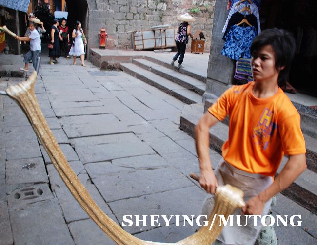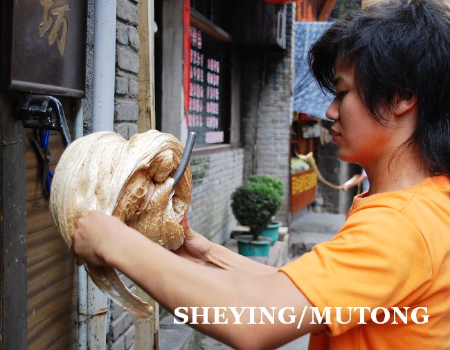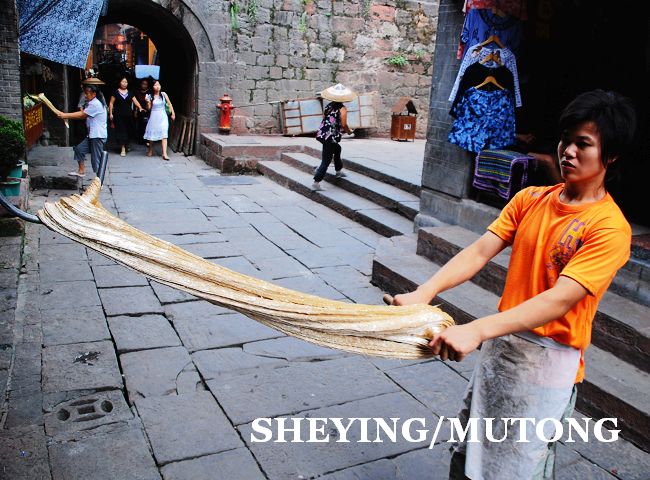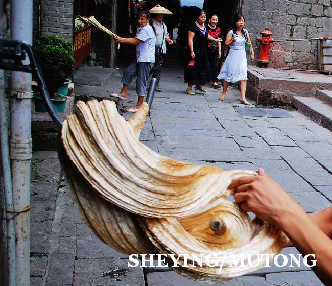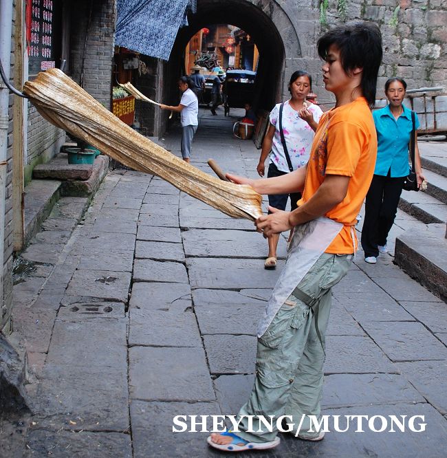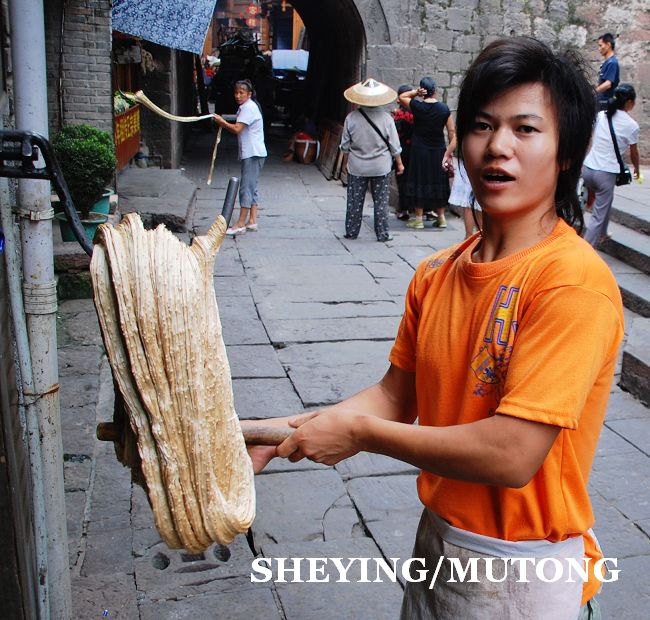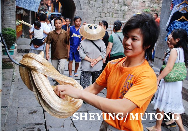 每天在古镇的街上都会有很多年轻人在自己的店铺门前手工制作姜糖,他们用足了力气。在凤凰古镇街