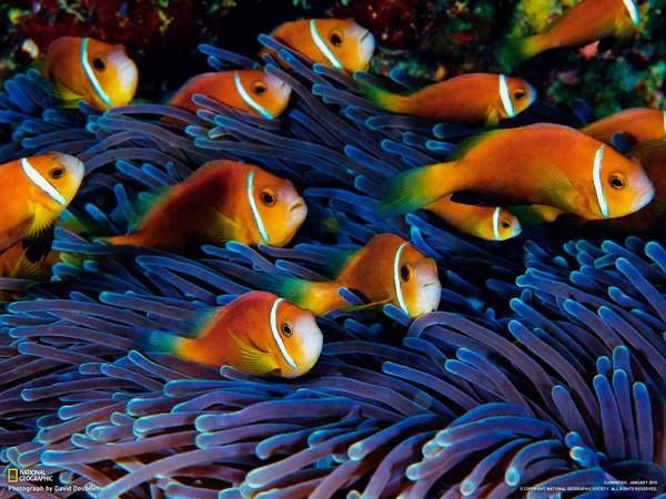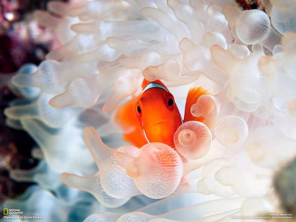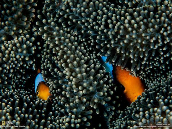 橙鳍双锯鱼(左为雄鱼,右为雌鱼)藏身在海葵的多刺触手中过夜,将这里当做庇护所来躲避石斑鱼等捕食者。