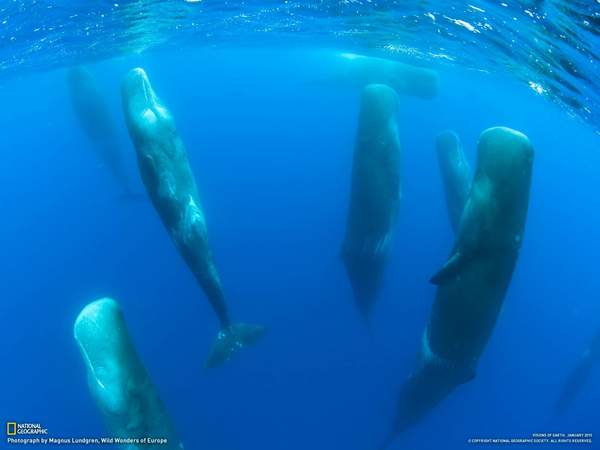 葡萄牙,亚速尔群岛附近,在阳光照耀的大西洋海面下,一群抹香鲸垂直漂浮着歇息。