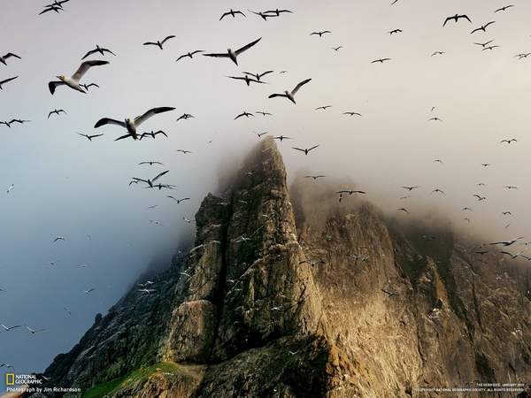 一群群海鸟在天空翱翔,狭窄岩脊上散布着许多鸟巢。波雷岛北端海拔只有384公尺,但是经常笼罩在云雾里。世上最大的塘鹅群在这里和附近的孤丘上繁殖,大约有6万对左右。