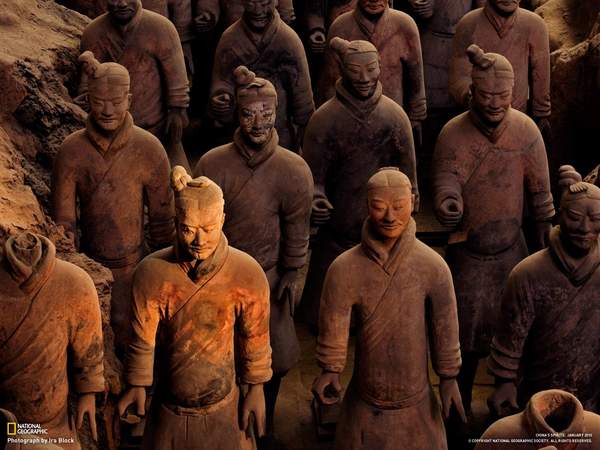 2200年前雕塑出来的兵马俑陪伴秦始皇进入永生,他们是为了在秦始皇仔细规划的来世里,和官吏、动物以及表演艺人一起为皇上效劳。