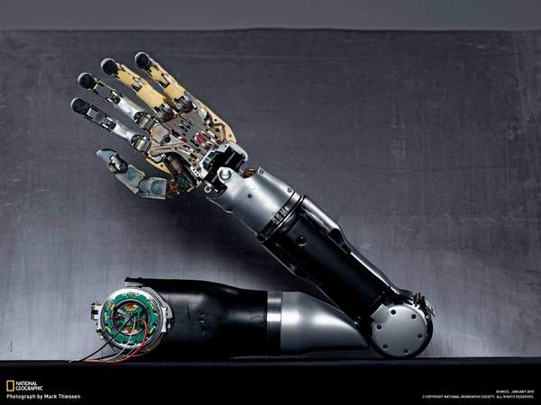 由20个马达驱动的尖端仿生手臂,以前所未见的精准度模仿血肉之躯的肢体。使用者是靠神经脉冲来控制。它甚至有感应器来记录触觉。