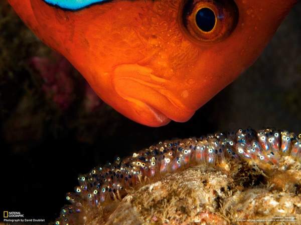 这只雄性的白条海葵鱼像园丁一样照料发育中的一片受精卵,并铲掉已死的胚体。它会扇动胸鳍,供氧给受精卵。