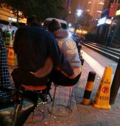 最近网友上传了一段视频,一男子半露着屁股趴在街头座椅震动臀部,边上疑似城管人员尴尬的来回走动大声喝斥,等男子起身后发现,身下压着一个活生生的红色长靴女子。。。
