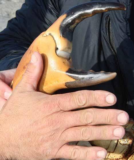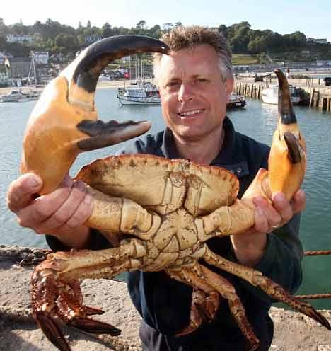 英国的潜水员Paul Worsley 在Dorset海岸Lyme湾的一只沉船附近捕获一只巨型螃蟹,重达17磅,蟹壳宽12英寸,巨大的蟹钳子和成年男子的手掌一样大小。