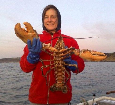 莉兹手拿一只巨型龙虾拍照留念。这个长度约1米,年龄可能100岁的大家伙是她与丈夫西蒙在德文郡沿岸捕获的。