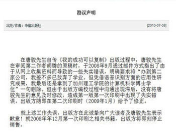 随着“学历门”事件的发酵,中信出版社发表勘误声明,称《我的成功可以复制》系出版社刊印错误。对此方舟子反驳说,自传出版一年多,印刷6次之多,“唐骏作为第一作者,居然一直都不知道该书的作者简介把他写成了加州理工学院的博士,到现在我把这个简介上传了,他才发现有误?”而即使是出版社勘误,也作为第一作者的唐骏也应该和出版社一样负责。其实,除非出版之后马上勘误、声明,在事发一年之后的勘误和声明,这样的更正是无效的。并且方舟子还称,出版社将错误一并揽到自己身上,是唐骏在背后公关让出版社出面揽责。