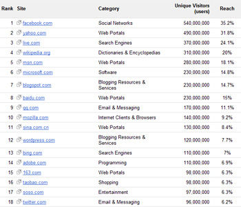 在谷歌发布的统计数据中,中国网站在前20名内占据了7个位置(三大门户网站里,新浪排名第11位、网易排名第15位,搜狐则不在20名以内)。谷歌表示,取样的用户达到数百万,整个过程由计算机算法完成。