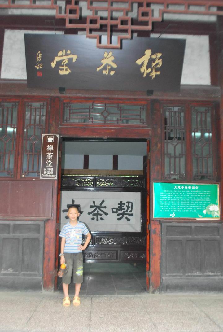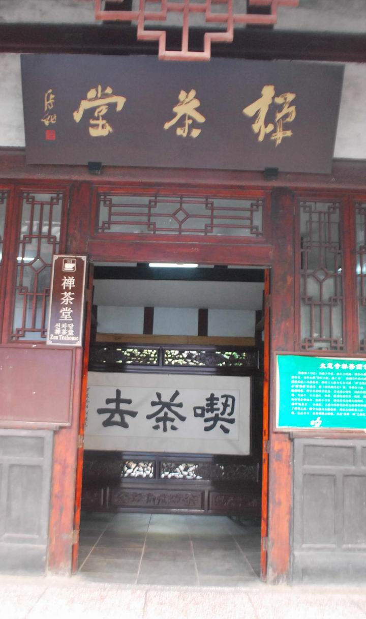 来到一院,门楣的匾额上写着“禅茶堂”,照壁屏风大书“喫茶去”三字,转过照壁,里面居然是一间相当别致的小院落,竹椅和小方桌依次排开,也是很别致地。却不见顾客,三两个工作人员模样的人在闲聊,见我们坐下,其中一位过来告诉说已经下班了,可以到本寺的另外一个茶馆喝茶。我说那咱们就这样坐坐吧!看桌上的茶牌,每道茶价格从15、20、40、60、80元不等。我们斋坐着,抚摸着黑漆小方桌的斑驳痕迹,看着朱红色高大的檐柱,和院子里那老银杏的沧桑树干,倒是能感受茶堂里清凉别致又温暖的气氛。