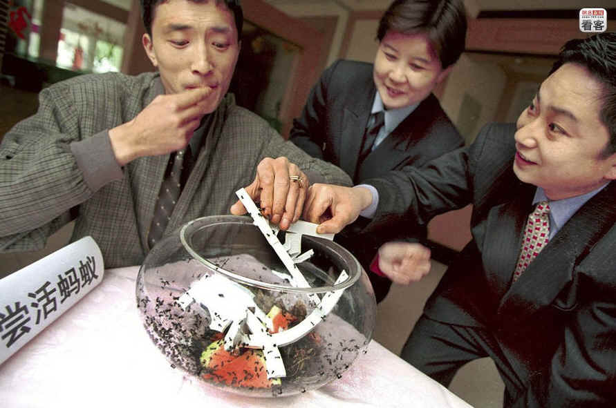 2001年4月26日,几名蚂蚁养殖专家在酒店的活动上试吃活蚂蚁。人们认为蚂蚁含有高蛋白,同时对人体有滋补养颜抗衰老等作用。除了对各种食物养生功效的听信,对美食本身的追求也使人们一直一来愿意尝试各种各样的食物以达到各种养生的功效。