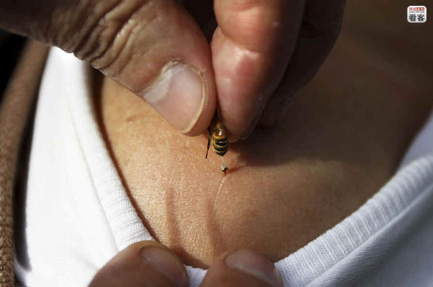 2010年4月24日,武汉汉口,一名医生给患者进行蜂疗。蜂疗应用蜜蜂尾针进行针灸,同时还利用尾针里的蜂针液对患者进行“以毒攻毒”的治疗。