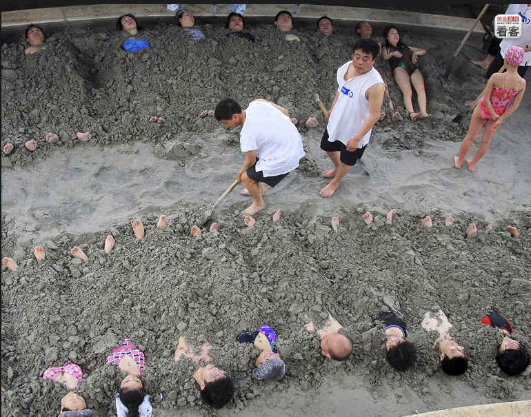 2010年5月2日,辽宁鞍山,汤岗子温泉全泥宫,游客在体验埋矿泥的魅力。随着各种西方科学报告对温泉和某些矿物泥的养生价值肯定,人们自然也对这些特别的养生方法表现出兴趣,相信能通过与皮肤的接触达到疗养的目的。