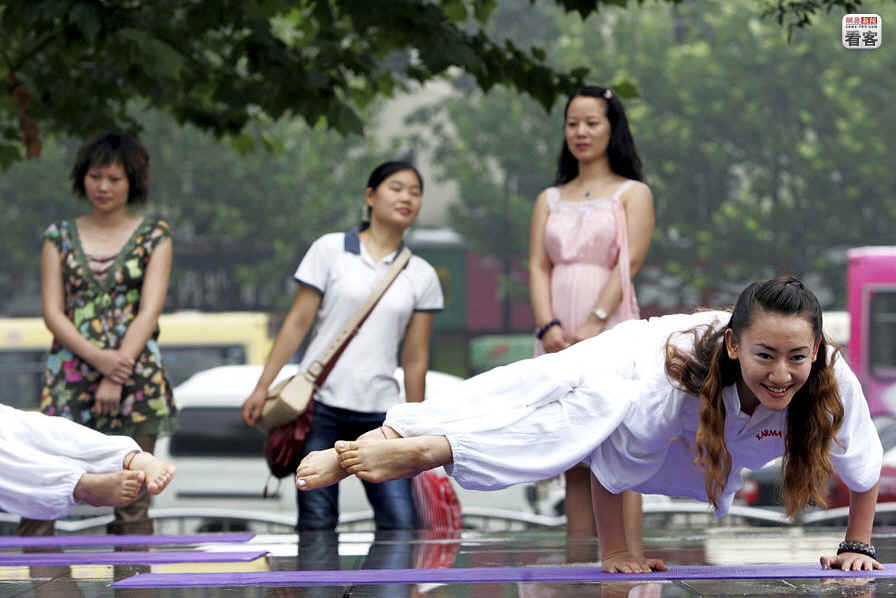 2005年8月7日上午,郑州市碧沙岗广场上,数名瑜伽功爱好者在教练的带领下正完成一些高难动作。尽管中医和中国传统养生文化在大多数人心里根深蒂固,以瑜伽为首的各种舶来养生文化也迅速占据了乐于接受新事物的年轻群体。