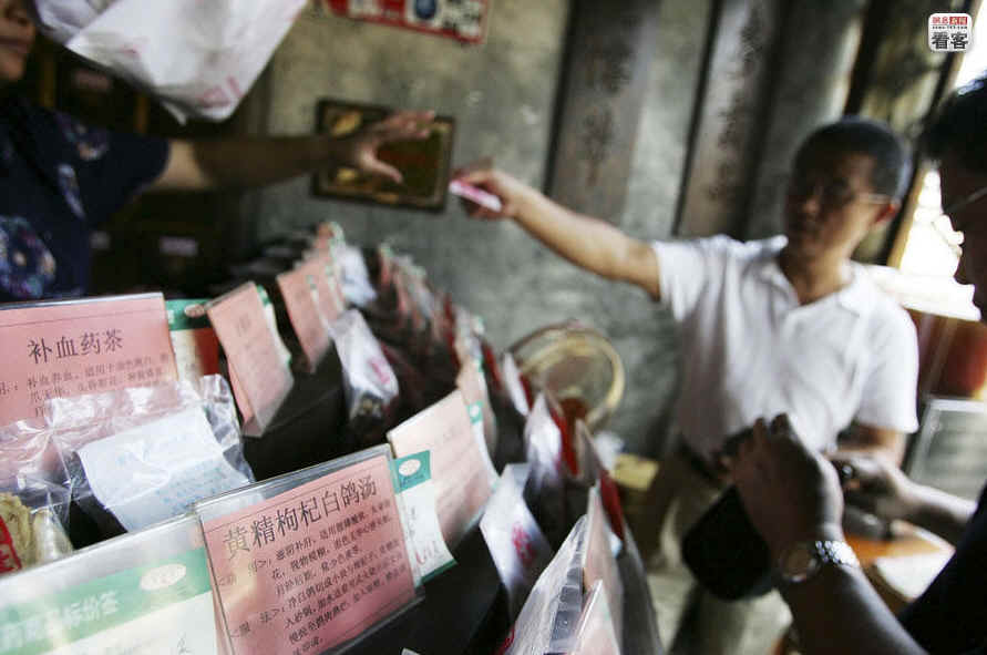 2005年9月6日上午,杭州河坊街上一家中药店内顾客正在购买各种保健茶。中医提倡的膳食调理,养胜于治等的理论已根深蒂固,因此如保健茶,保健汤,凉茶等的汤饮调养店铺尽管不断改良变化,却从来没有在中国消失过。