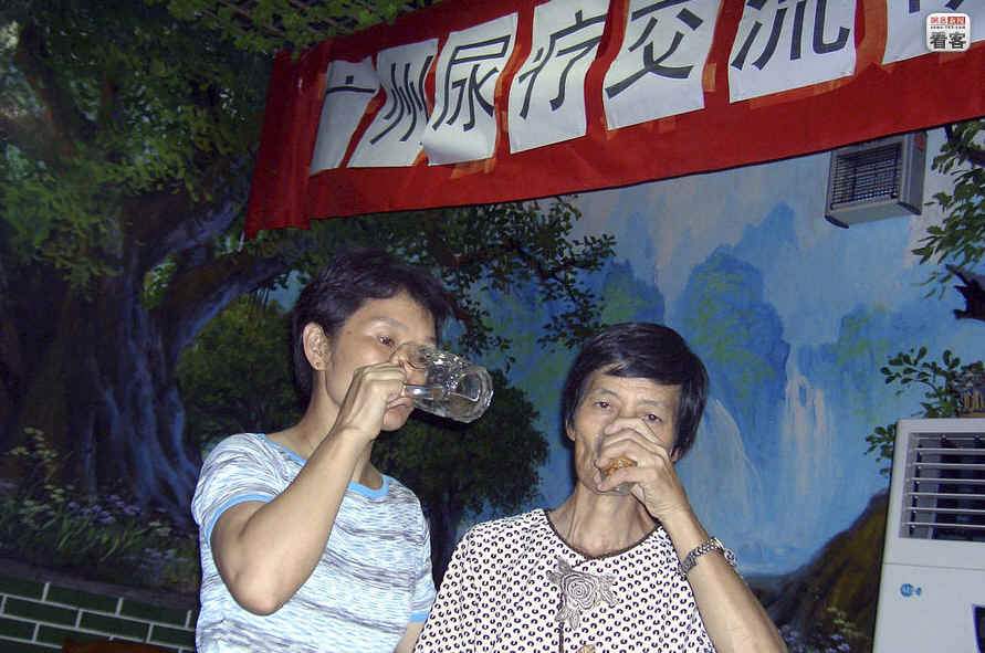 2004年8月8日,大约30名相信喝尿养生的中老年人相聚广州新市某饭店,大家畅谈一番“喝尿有益健康”的心得后,相继端杯到厕所取出自己的尿液当众喝下。