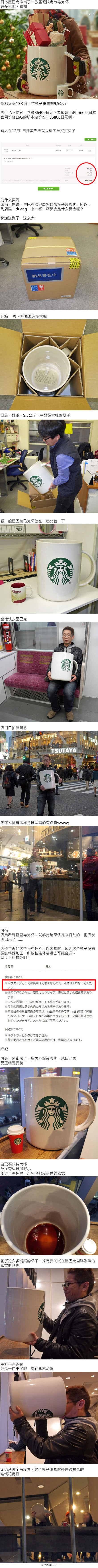 最近,日本星巴克推出了一款圣诞节限定巨型马克杯,巨大,杯口直径30公分,价格也巨贵,售价86400日元(差不多一台iPhone6s的价格)。还真有人买了一个杯子,拿到星巴克店里想试试,不是说欢迎自带咖啡杯吗,那自带这个杯子能不能给我装满…