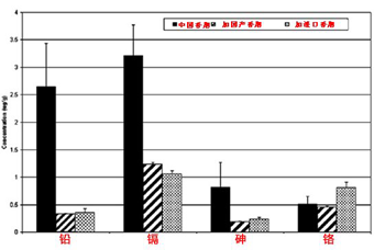 实际上,中国香烟的重金属含量一直都很高。据《美国、日本和国产香烟中铅含量的比较》显示,德国海德堡大学的一名教授曾经做实验比较了中国、德国、俄罗斯、印度、希腊和加拿大的香烟中镉的含量,结果显示中国的香烟中镉含量是最高的,是最低的希腊的6倍多。10多年前,中国学者也做过这方面的研究,比较中国、美国、日本三国香烟中铅的含量,结果发现,某种上海产的香烟中铅含量是美国产的12.4倍,是日本产的4.5倍。
