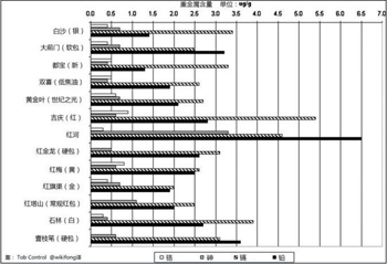 学者实验结果表明,当土壤中加入不同浓度的铅时(0-2500mg/kg),烟草对土壤中的铅具有较强的吸收性,并可残留在作物的各个部位;当土壤中锰添加浓度为1500mg-2500mg/kg时,烟草植株仍能生长,但烟草叶、茎和根的锰含量逐渐增加,烟草地上部分锰积累量最高达到13.5g/kg;烟草植株中含有高剂量铅、锰等金属,虽然致使植株生长发育受阻,但是促进了镉的吸收。因此,与烟草中部分有机物是植株成分或在生产环节添加不同,铅、镉、锰、砷等无机化学物,更多地来源于环境。这一点得到了云南烟草科学院有关负责人的认同。尤其是在云南,这里因矿产资源丰富,素有有色金属王国之称,土壤中难免含有重金属物质。然而云南却又是中国重要的烟草产地之一。