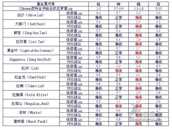由以上的研究可以看出,中国的香烟十几年来,重金属含量一直高于其他国家,这一部分源于源于中国一直没有卷烟产品重金属含量的国家标准,甚至行业标准。国家质检总局也没有单独开展这项检测。