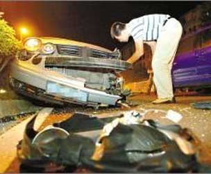 由于路面积冰,车辆打滑,夏利车撞向了路北侧的防护墩……