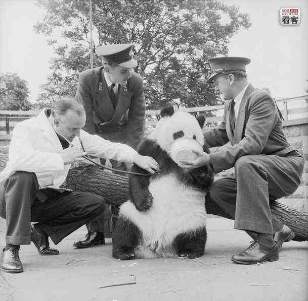 西方国家在对红色中国实施经济封锁和政治孤立的同时,也通过各种手段获得大熊猫。1958年,奥地利动物商海尼·德默于以三只长颈鹿、两只犀牛以及河马、斑马等,与北京动物园换得的一只雌性大熊猫“姬姬”,它也是世界自然基金会会徽上那只大熊猫的原型。图为1958年10月16日,伦敦动物园,三名工作人员对初来乍到的“姬姬”进行第一次身体检查。