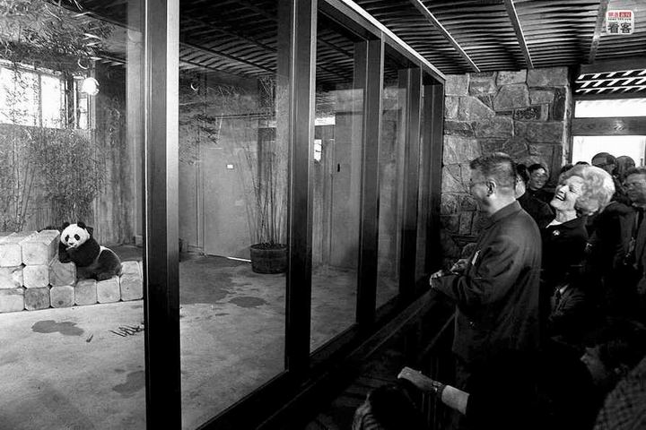 最著名的“熊猫外交”发生在1972年。时值尼克松访华,中美关系解冻,周恩来宣布将大熊猫“玲玲”和“兴兴”作为友谊大使赠送给美国。当“玲玲”和“兴兴”乘专机抵达华盛顿国家动物园时,受到8000名美国观众的冒雨迎接。开馆与观众见面第一个月,参观者就多达100余万。图为1972年4月20日,华盛顿国家动物园,尼克松的夫人欢迎大熊猫入住新居。