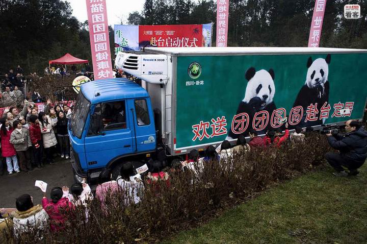 与此同时,大熊猫也会进行短期的出国活动。2001年,国际奥委会在俄罗斯决定2008年奥运会举办国的时候,大熊猫“奔奔”和“文文”就作为文化使者赴莫斯科为中国“助威”。而富有政治意味的赠送仅限于国内,例如香港、台湾。图为2008年12月23日,大熊猫“团团”和“圆圆”被装车运往四川雅安一个繁殖基地,准备送往台湾。