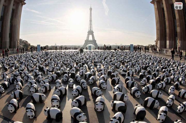 目前,现存的大熊猫约有1595只,且在不断减少。截至2010年,圈养大熊猫的总数达到317只。但据科学家统计,其中有78%的雌性大熊猫不孕,有 90%的雄性大熊猫不育。图为2008年10月18日,法国巴黎,世界自然基金会(WWF)将1600只纸质熊猫模型摆放在埃菲尔铁塔前,呼吁保护濒危物种。