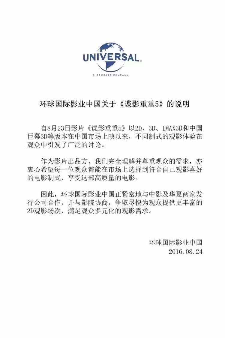 24 日晚间传来的消息,《谍影重重5》的出品方环球影业发布公告称,正在跟中影及华夏两家发行机构合作,争取尽快为观众提供更丰富的 2D 场次。