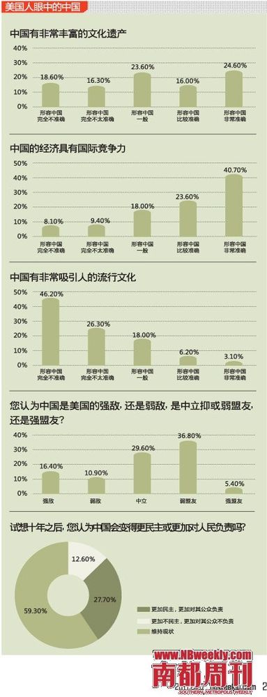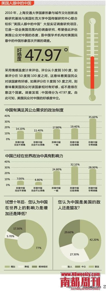 调查结果显示,逾六成美国人眼中的中国已在世界政治中具有影响力、在世界经济中具有竞争力。以“情感温度计”来评估,中国在美得分为47.97度,好感度为中立。